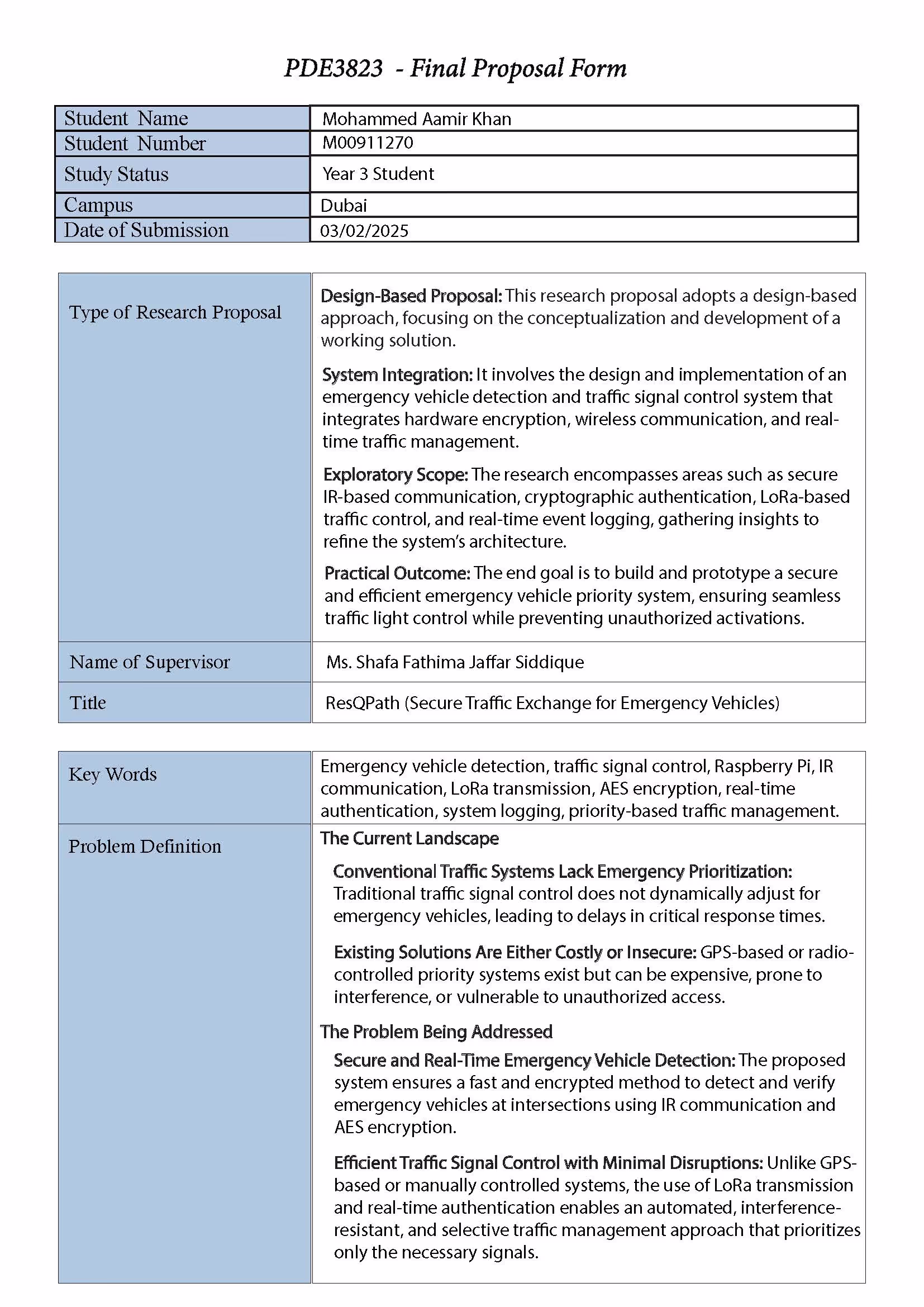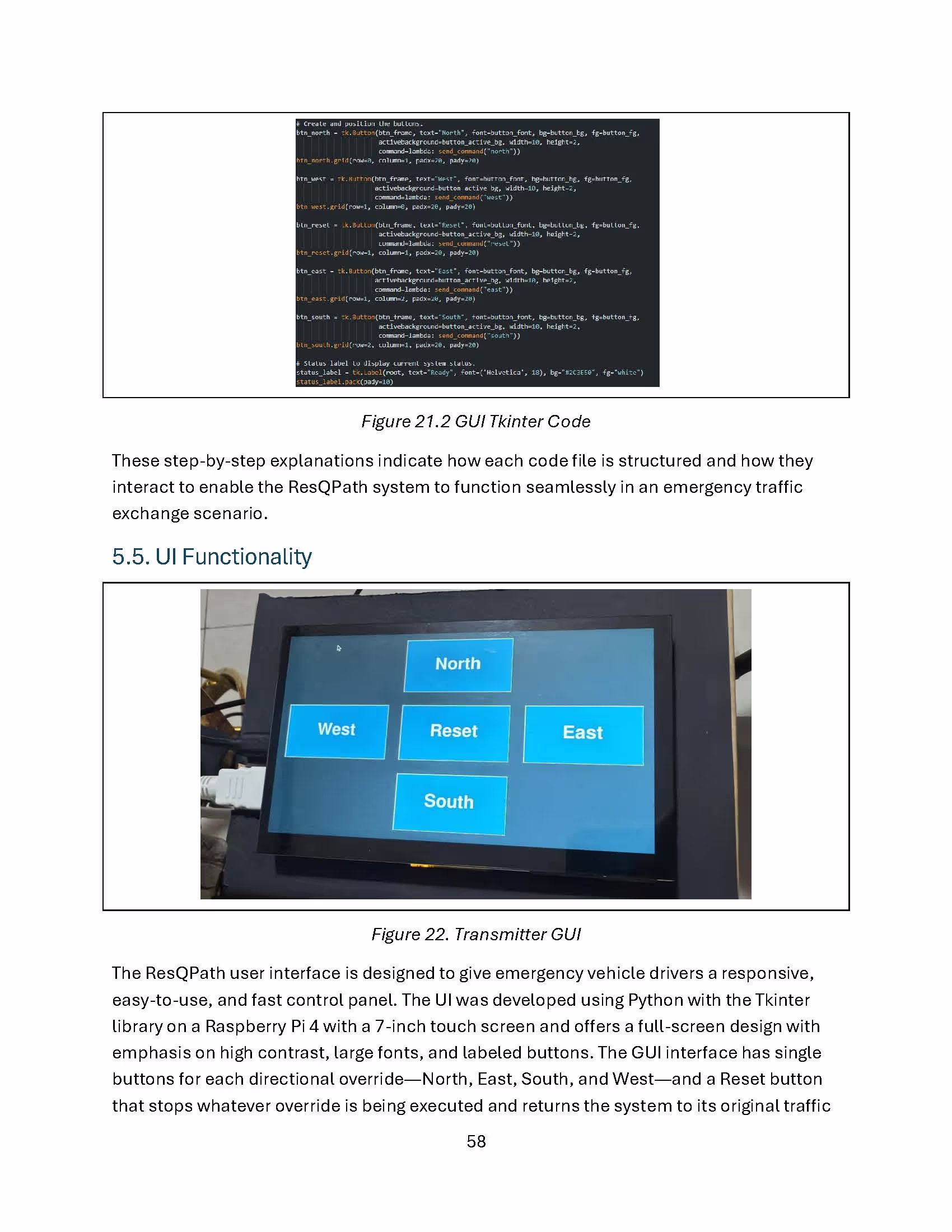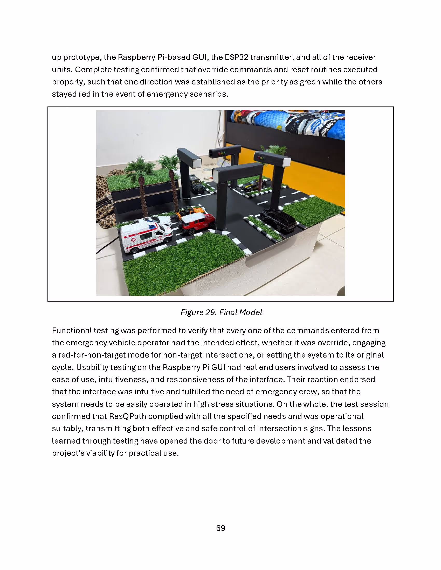 The project also features a user-friendly control interface built on a Raspberry Pi 4 with a 7-inch touchscreen. This interface, developed using Python and Tkinter, allows emergency personnel to easily send override and reset commands, as well as monitor the system’s status in real time. Through rigorous testing and iterative development, ResQPath has evolved into a robust prototype that not only meets its functional requirements but also offers ample potential for future enhancements and broader deployment.
