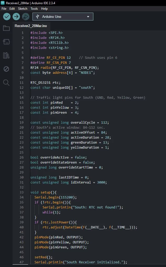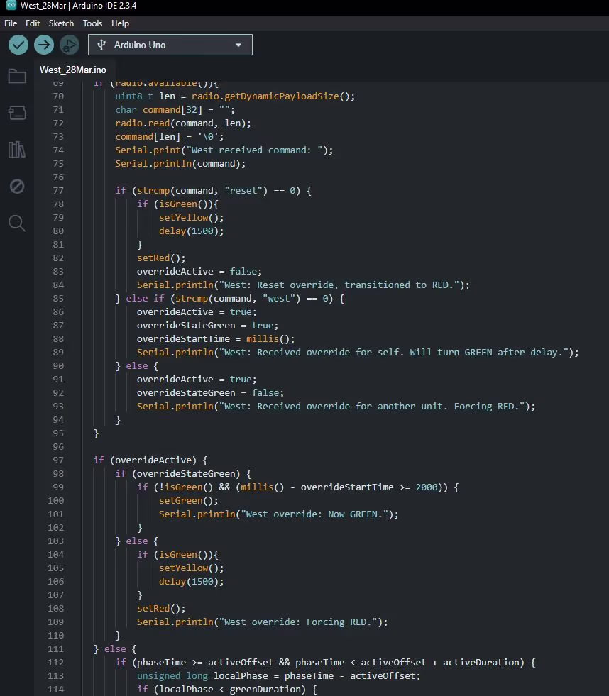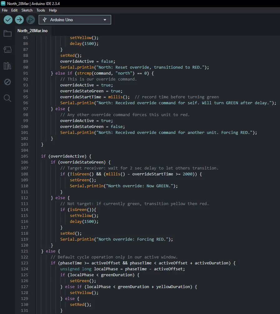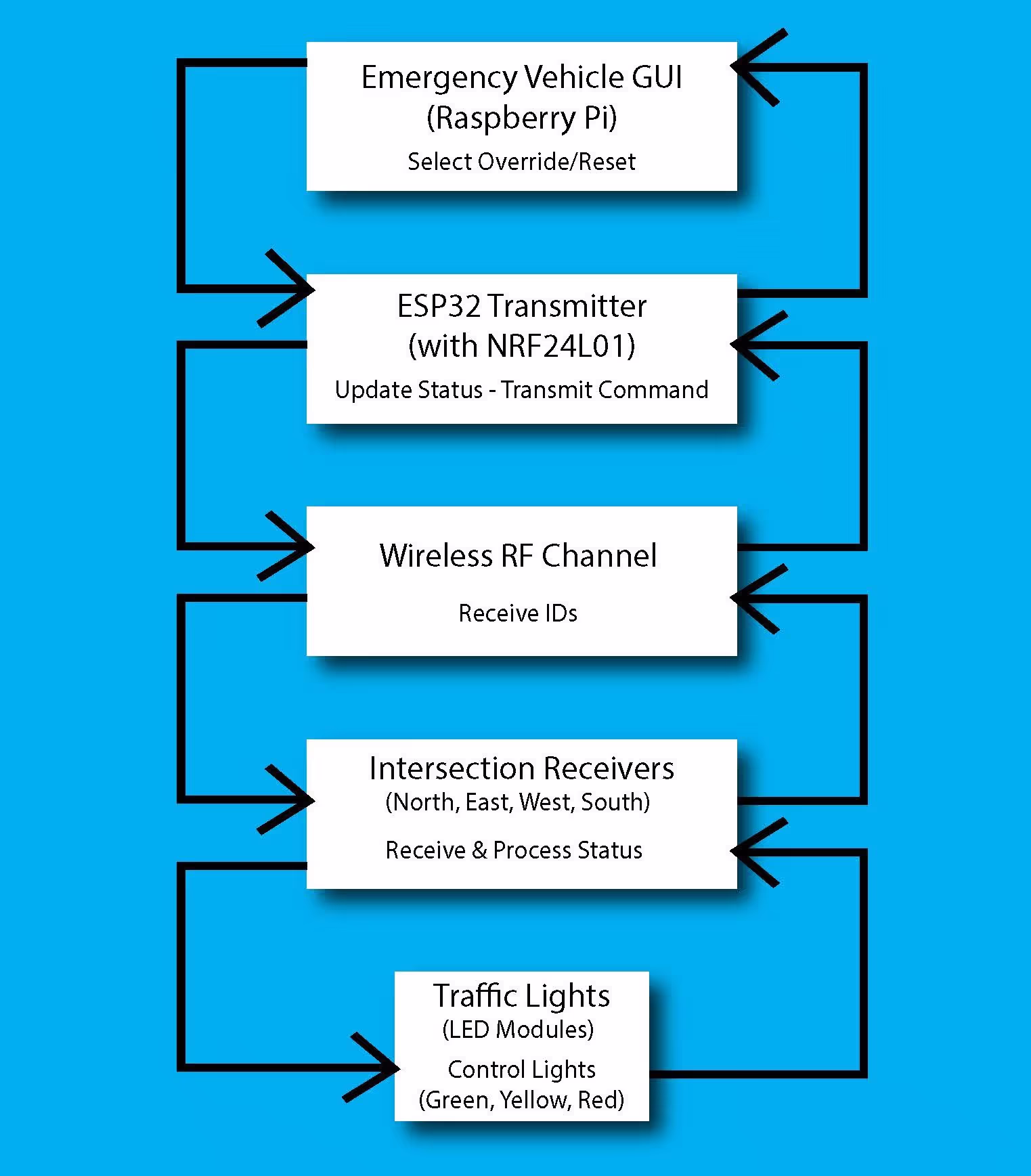 At its core, ResQPath utilizes ESP32 microcontrollers paired with RF modules to communicate override commands wirelessly. Each intersection is controlled by dedicated receiver units with synchronized timing provided by DS3231 RTC modules. When an emergency override command is triggered, the system instantly changes the traffic light in the designated direction to green while forcing all other directions to display red, ensuring a clear path for the emergency vehicle.