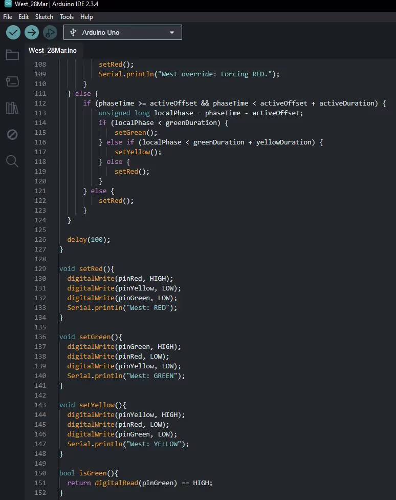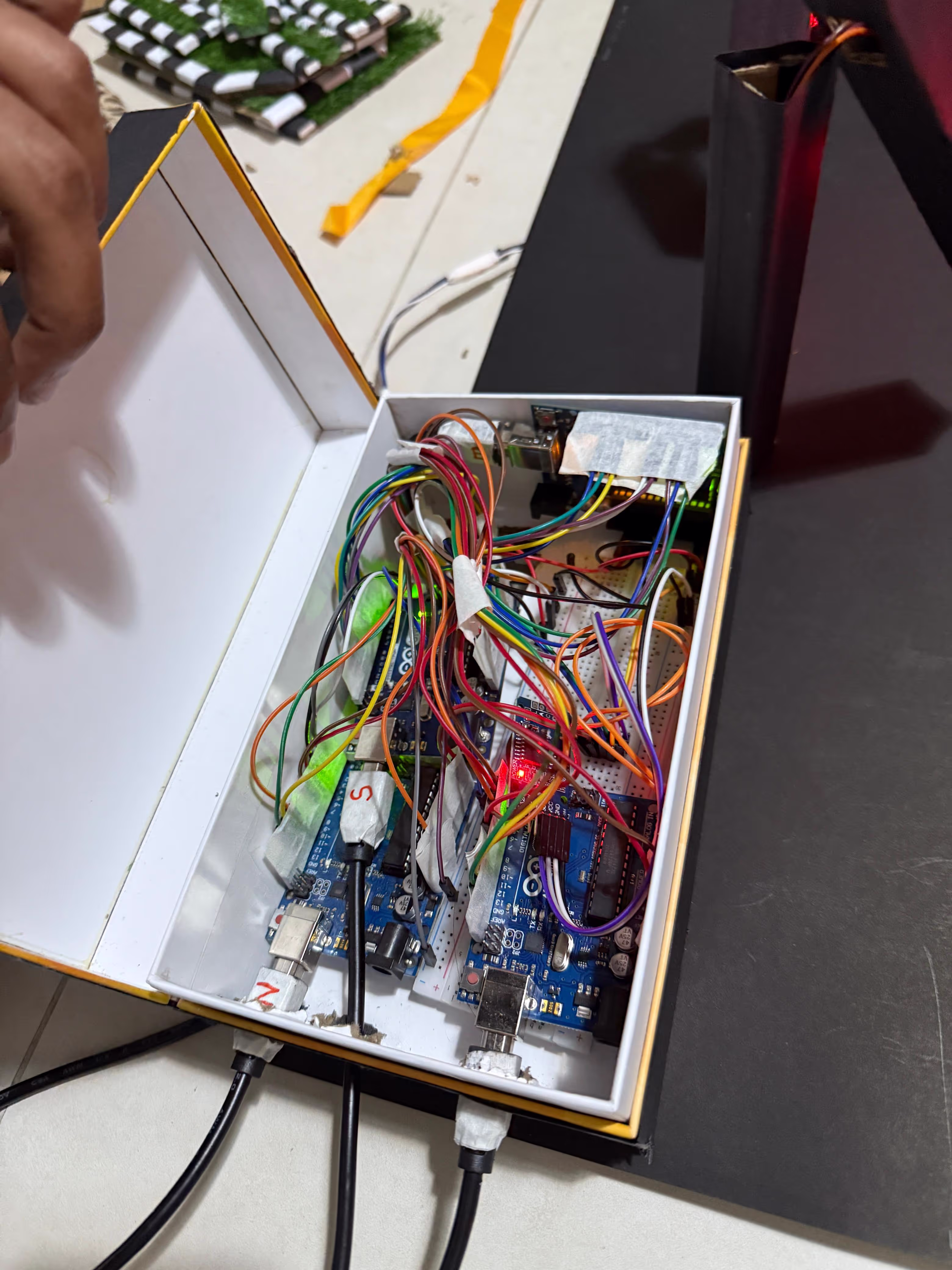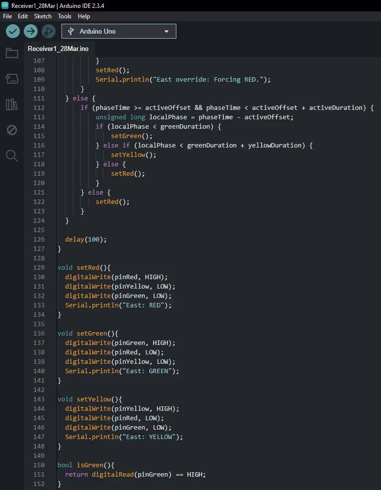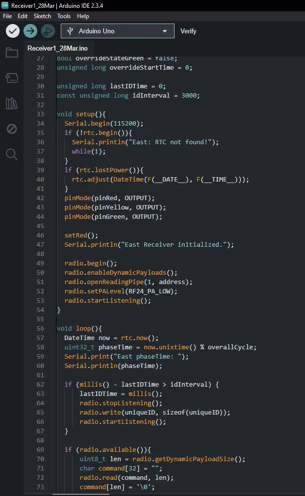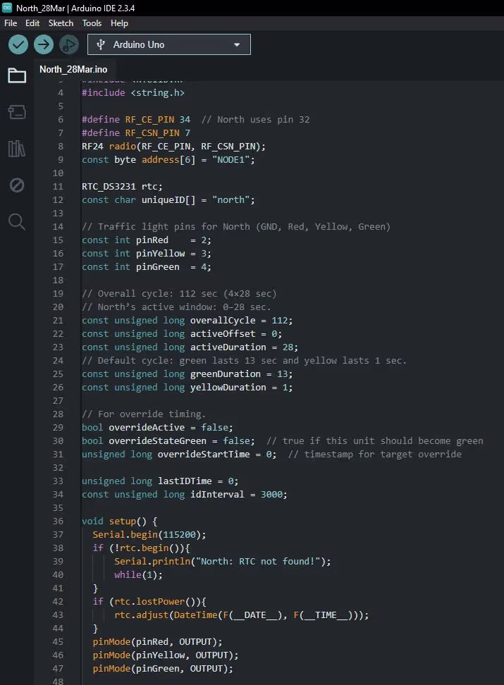 At its core, ResQPath utilizes ESP32 microcontrollers paired with RF modules to communicate override commands wirelessly. Each intersection is controlled by dedicated receiver units with synchronized timing provided by DS3231 RTC modules. When an emergency override command is triggered, the system instantly changes the traffic light in the designated direction to green while forcing all other directions to display red, ensuring a clear path for the emergency vehicle.